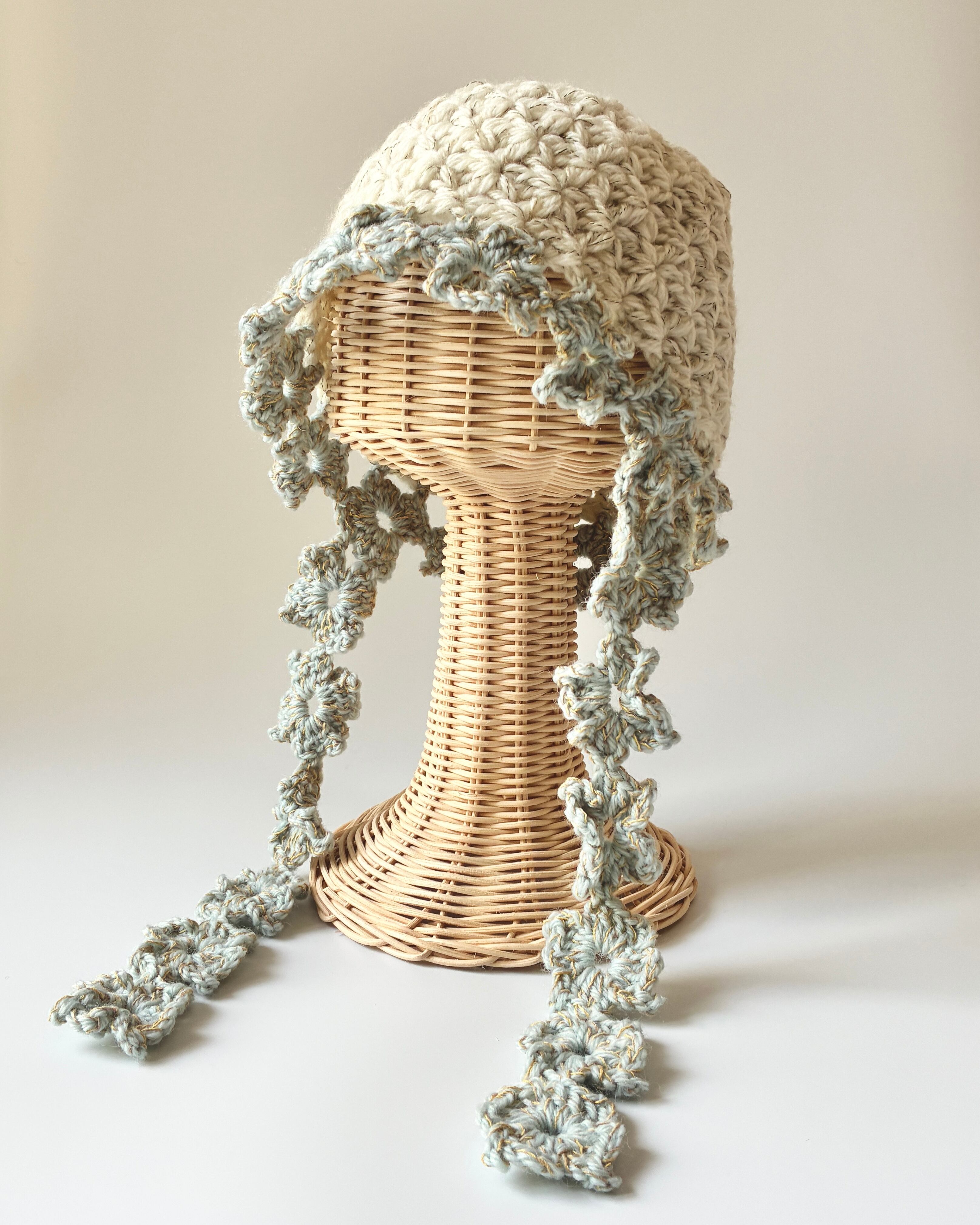 お花モチーフをつなげたラブリーな帽子。